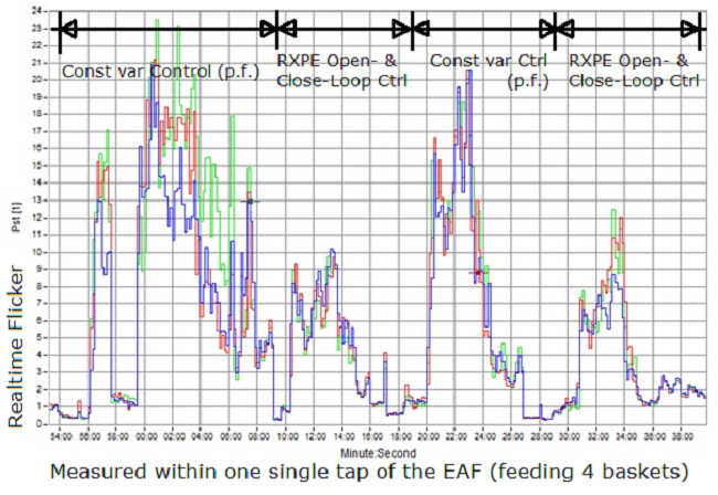 RXPE - 11A C&P 系统在这个项目中配备了我们强大的“开环和闭环”控制固件。下面是“常量无功控制(无闪变抑制)”和我们获专利的开闭环控制在熔炉单一充电期间实时闪变测量的比较,通过在 HMI 上手动切换不同的控制模式来实现。它显示了 RXPE SVC 闪变抑制系数达到 50 % 以上(接近技术极限)。